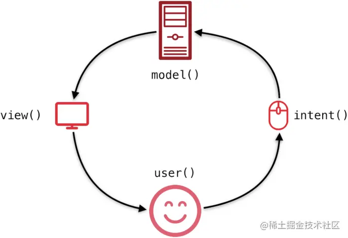 MVIMVVM 很相似,其借鑑了前端框架的思想,更加強調數據的單向流動和唯一數據源,架構圖如下所示
