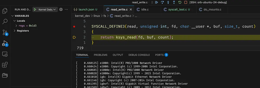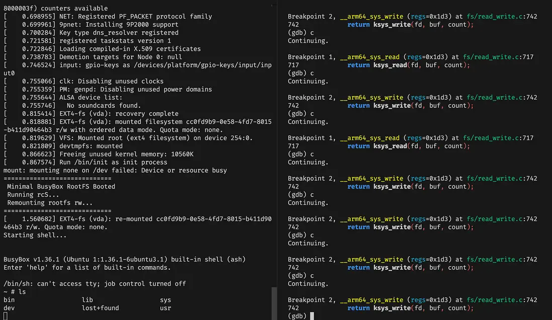現在,切換回運行 QEMU 的那個終端窗口,你會看到內核的啓動日誌開始滾動輸出。當內核執行到 read 或 write 系統調用時(例如,shell 嘗試讀取用户輸入或打印輸出時),執行流會在 GDB 中暫停,並顯示命中斷點的信息。屆時你就可以使用 GDB 的各種命令(如 n (next), s (step), p (print), bt (backtrace) 等)來檢查代碼和狀態了。