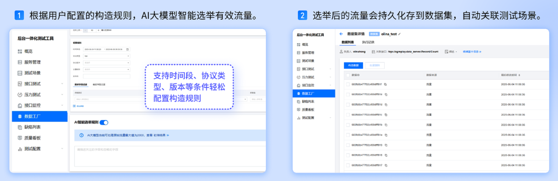 通過AI智能分析,將流量進行自動打標,生成接口構造規則,再根據用户測試需求有效選舉,自動沉澱並定時更新數據集。