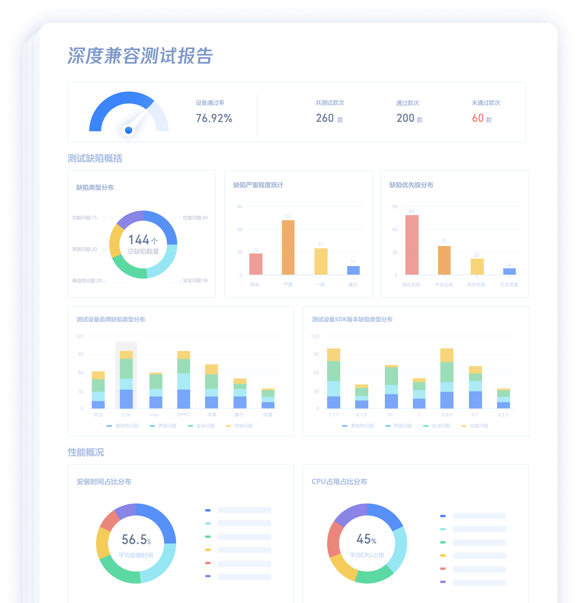 支持安裝啓動、隨機遍歷10分鐘、退出卸載測試過程,提供具備兼容性特性的雲端設備,通過模擬真機測試,及時發現應用中出現的兼容性問題。