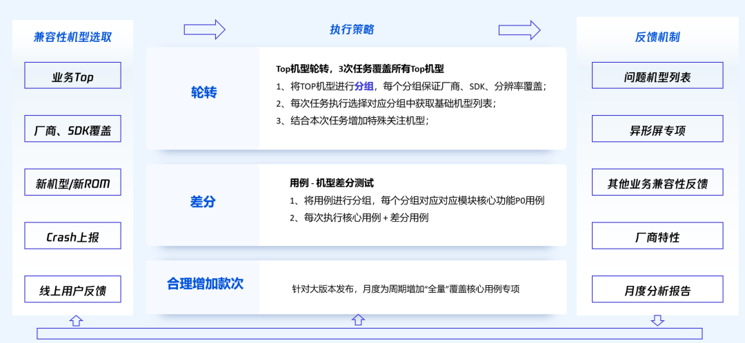 - 層級劃分:將Top機型分組開展兼容測試,確保P0級核心用例在Top機型全面覆蓋。根據待測場景的特點,將機型與用例進行二次篩選,通過差分測試覆蓋中長尾機型和更多場景。