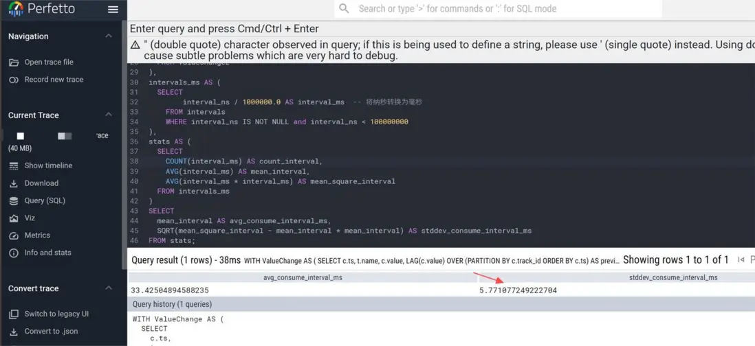 Perfetto生成的Trace文件可以通過SQL進行統計。筆者統計了每次BufferQueue減少時的時間點,進一步計算了這些時間間隔的標準差。該指標可用於量化畫面抖動的嚴重程度,為後續方案對比與優化提供了數據基礎。