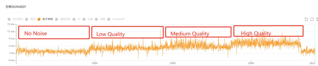 A:我在OPPO R17測了下,場景裏播100個粒子系統*50粒子,前後分別設置為關閉Noise模塊、開啓Low/Medium/High Quality的Noise模塊,得到的粒子系統耗時變化如圖: