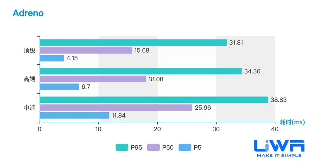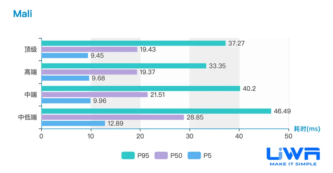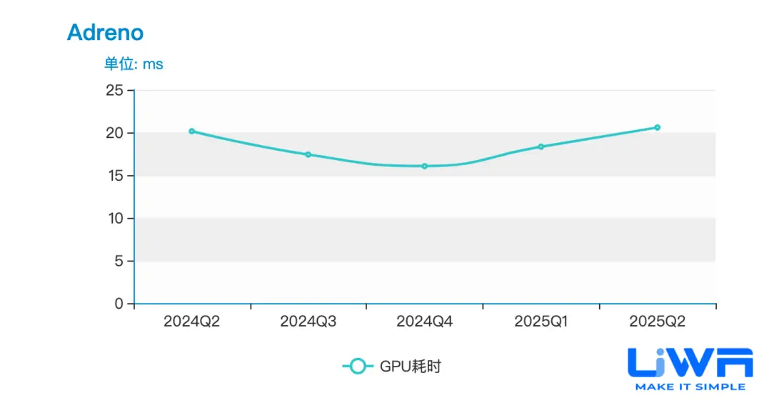 GPU耗時表示GPU處於工作狀態的時間,我們在這個方面迭代了大量的計算版本來提升改數值的精準性。雖然由於GPU可以在不同的頻率下工作,工作時間並不直接反應工作壓力,但該數值仍可以針對不同的芯片來進行較為精準地反饋,下面是Mali芯片和Adreno芯片上該指標的性能趨勢。