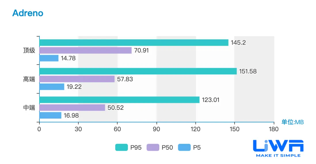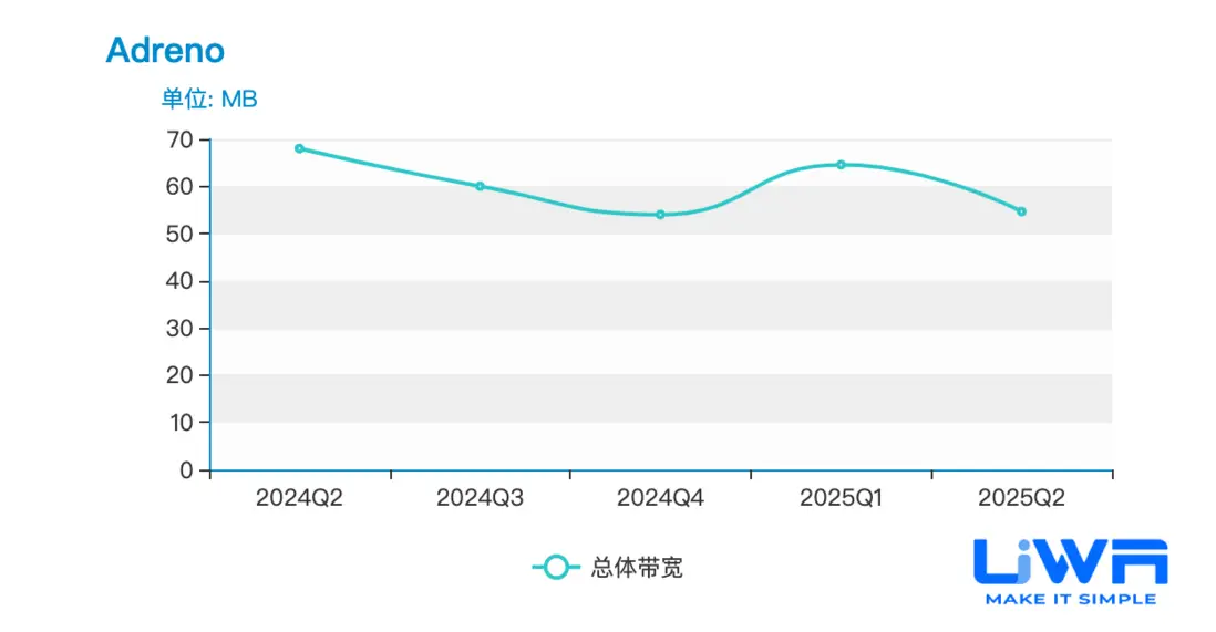下圖為Mali芯片和Adreno芯片的平均帶寬佔用趨勢,基本上都控制在50~70MB/幀,該範圍較為合理。因為如果遊戲以30幀/秒的幀率進行運行,那麼每秒的GPU帶寬將達到1.8~2.4GB,一般我們建議主流機型(比如小米 10)的帶寬量儘可能控制在3.0GB/秒以下較為合適,但如果您的遊戲希望達到60幀,那麼該流量則過大了,會很快導致設備發熱進而降頻,因此,UWA建議研發團隊儘早通過量化指標來建立研發標準,否則越到研發後期,返工成本越高。