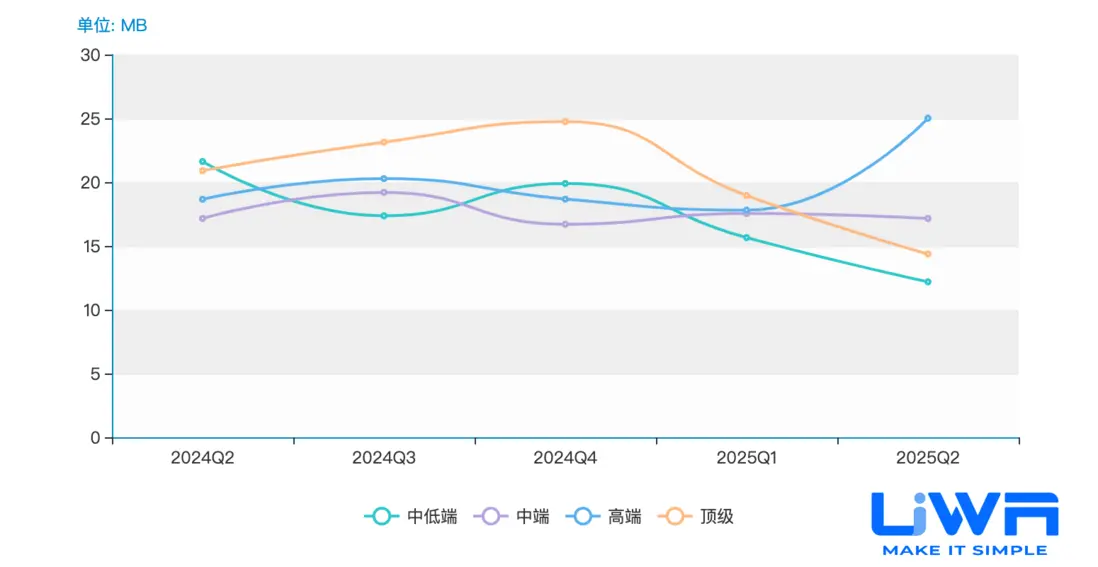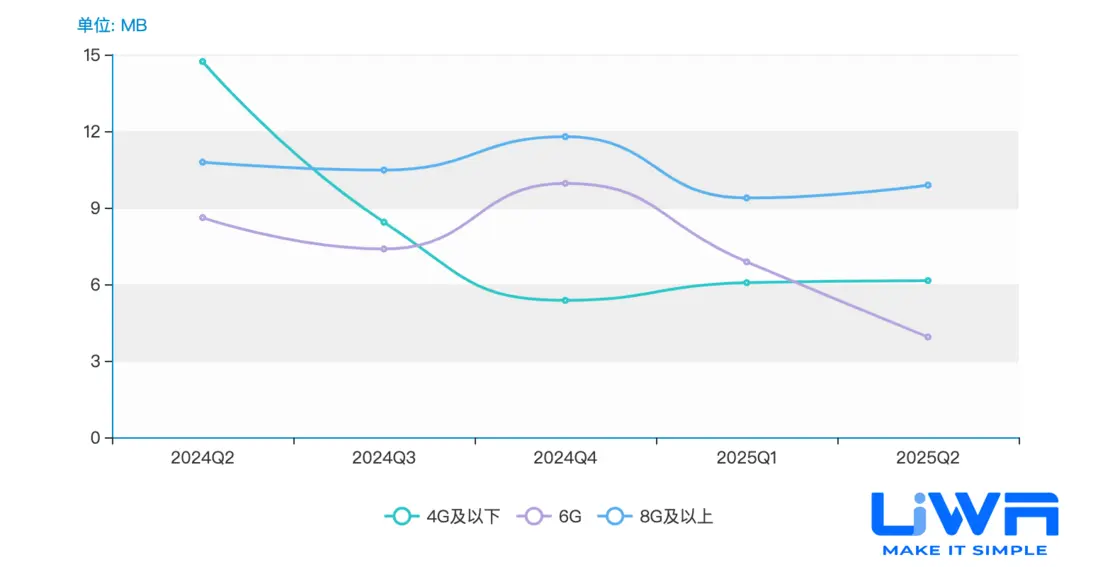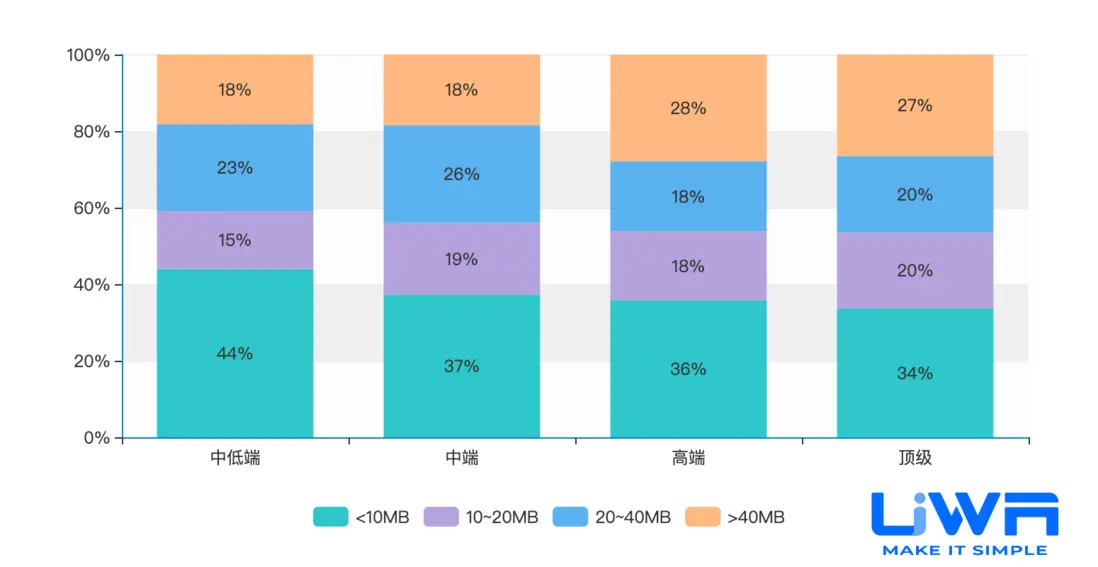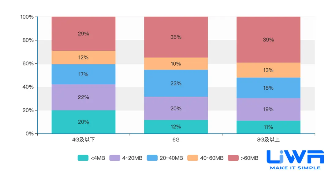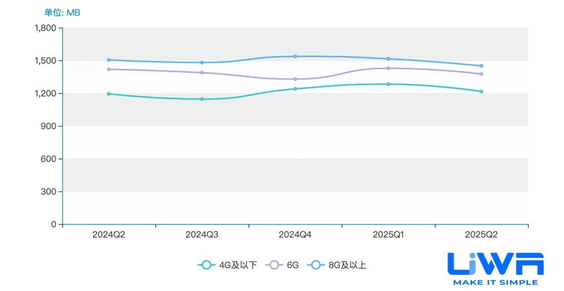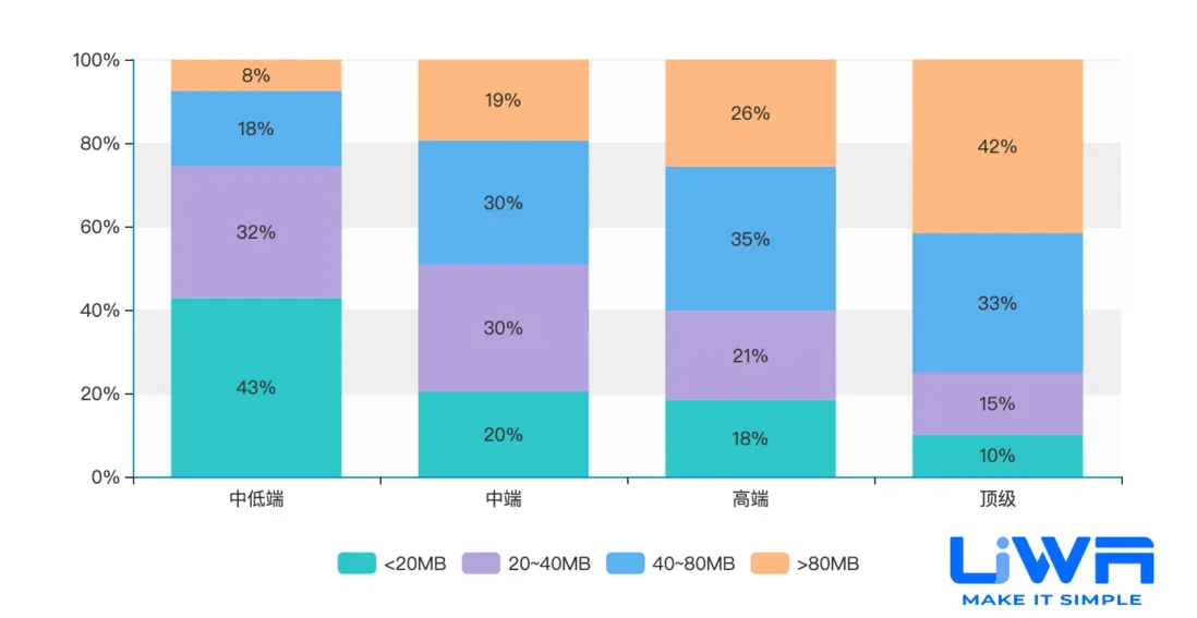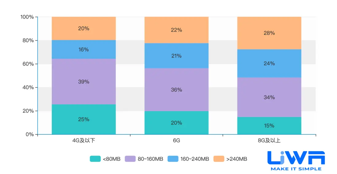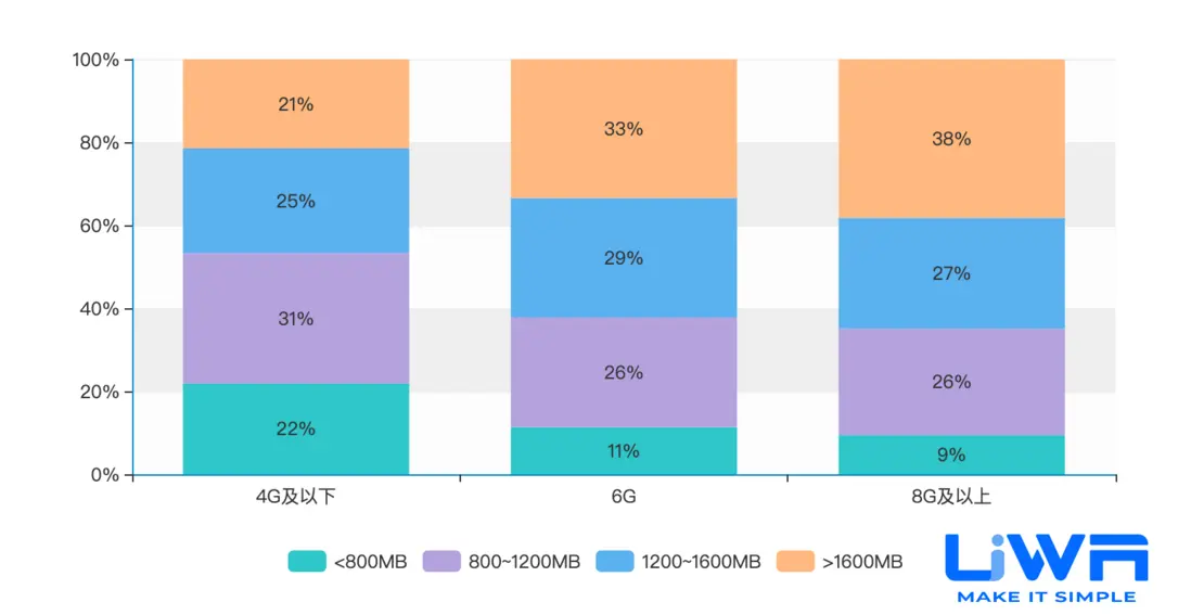 4GB內存以下設備的內存佔用(中位值)在1.1GB-1.3GB之間,4GB內存以上設備的內存佔用在1.2GB-1.6GB(中位值)之間,且無論是低端、中端還是高端,整體趨勢較為平穩。