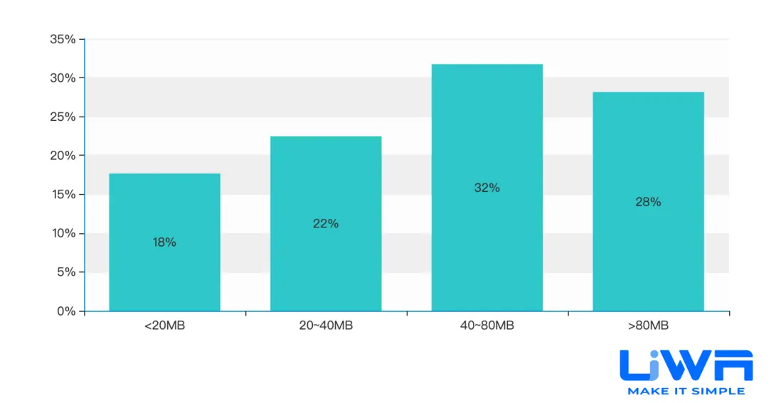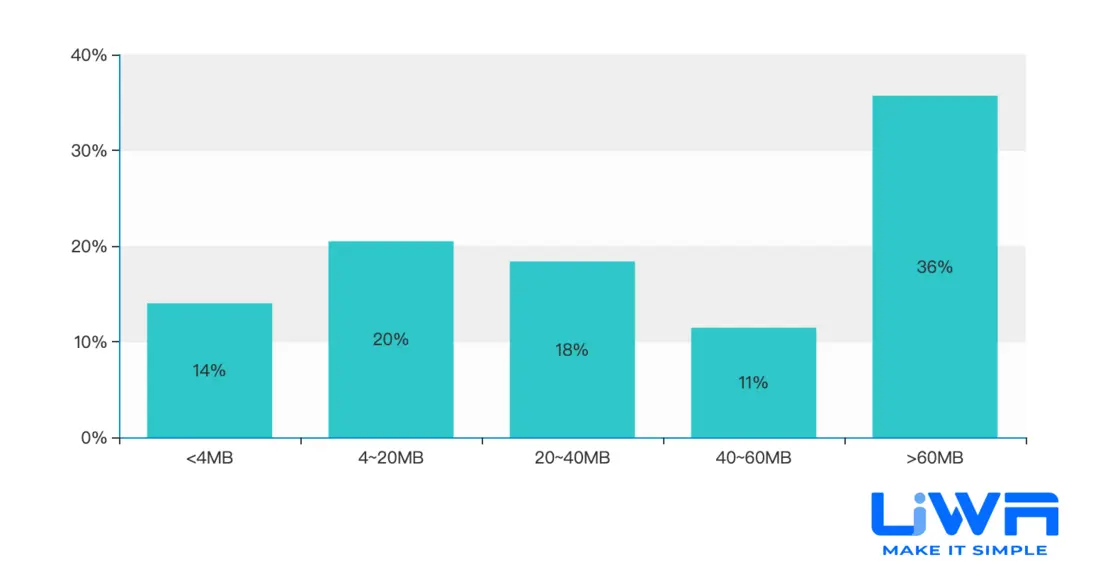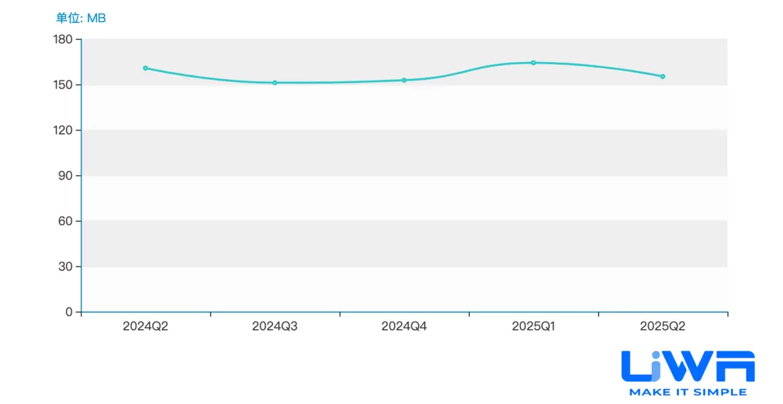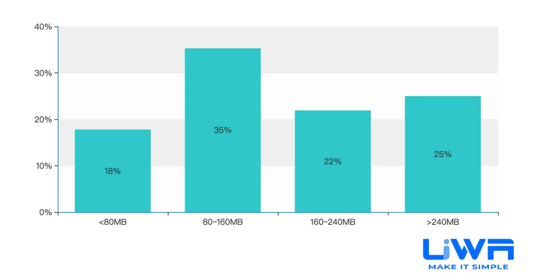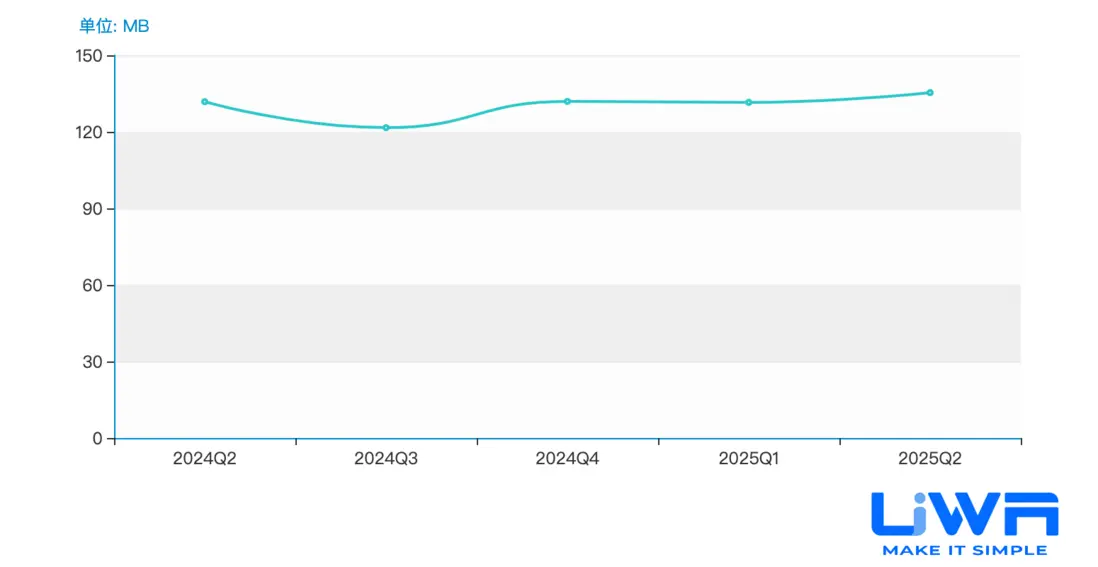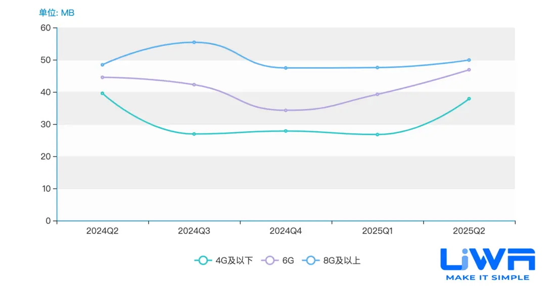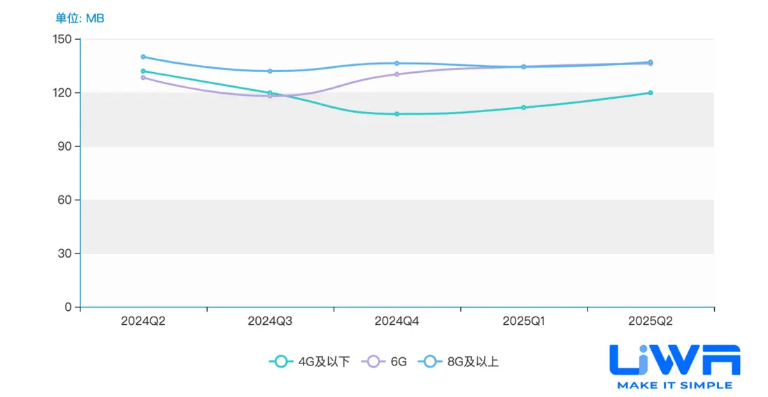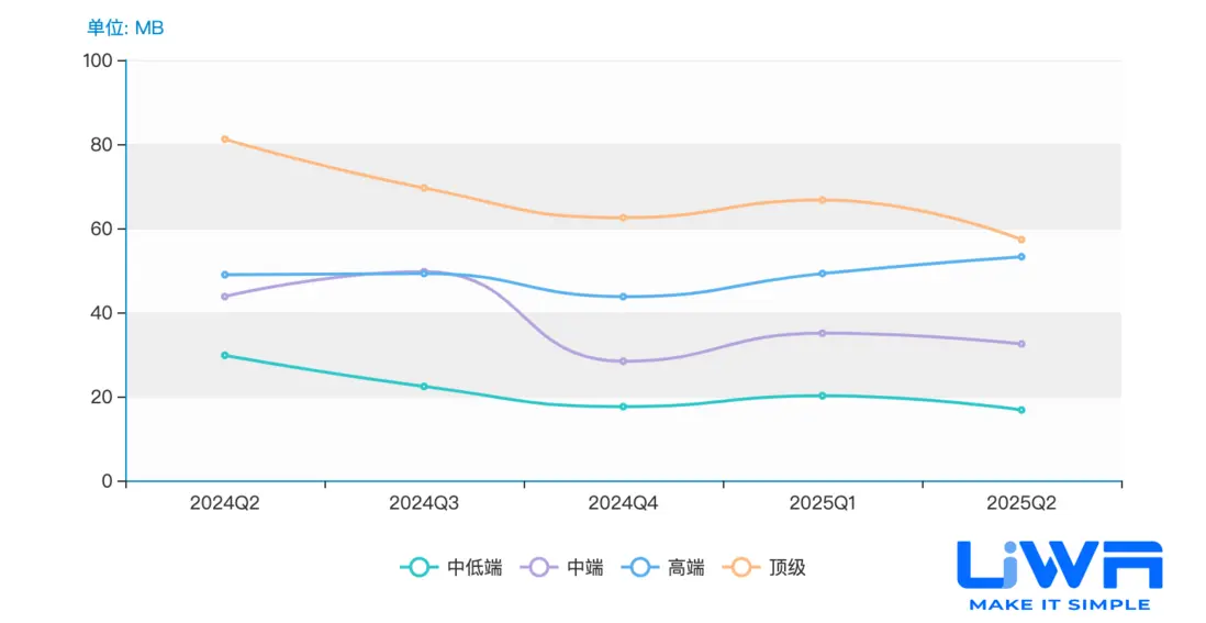 4GB內存以下設備的內存佔用(中位值)在1.1GB-1.3GB之間,4GB內存以上設備的內存佔用在1.2GB-1.6GB(中位值)之間,且無論是低端、中端還是高端,整體趨勢較為平穩。