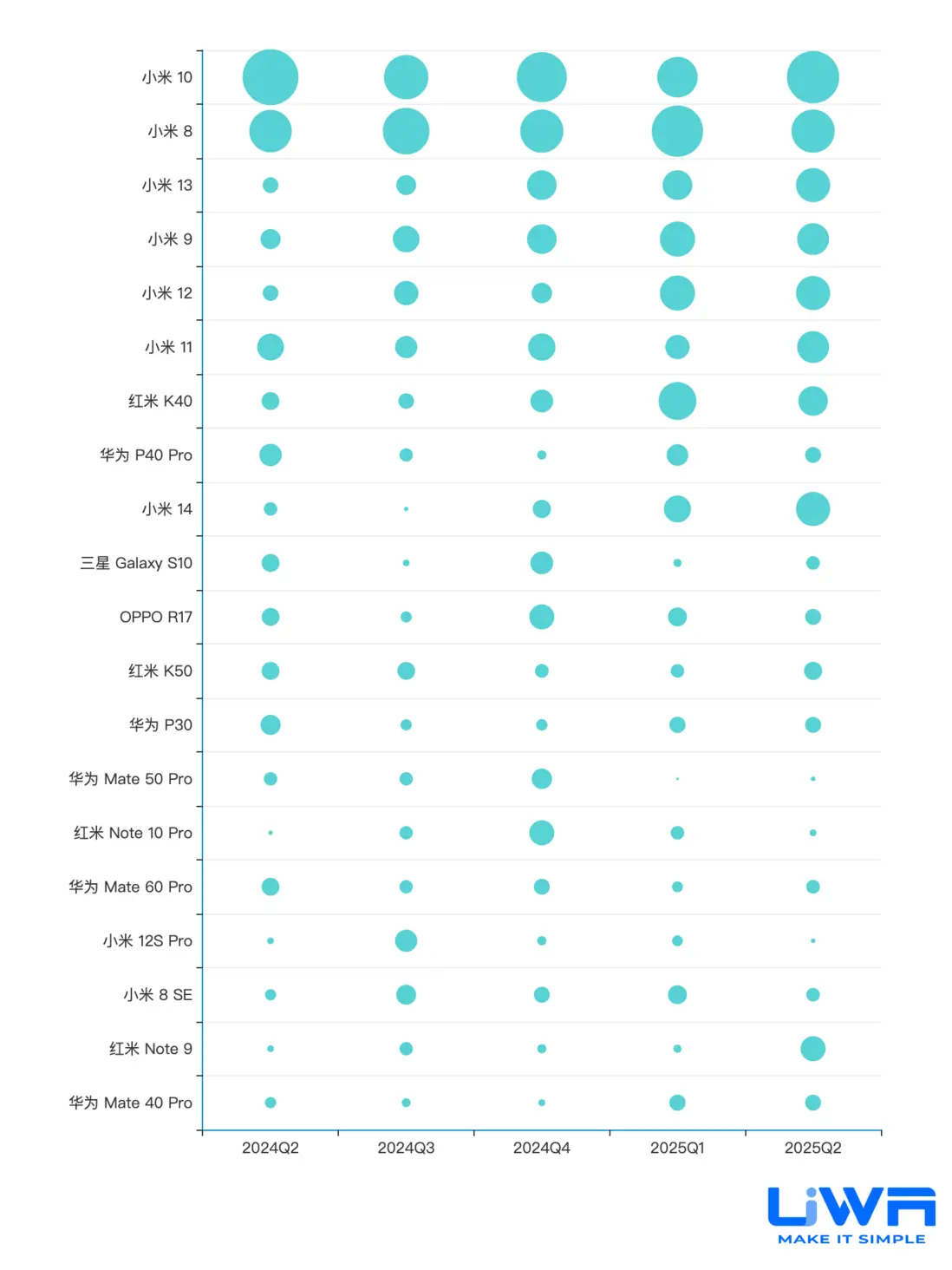以小米 10、小米 8和小米 13作為測試機的數量明顯提升;