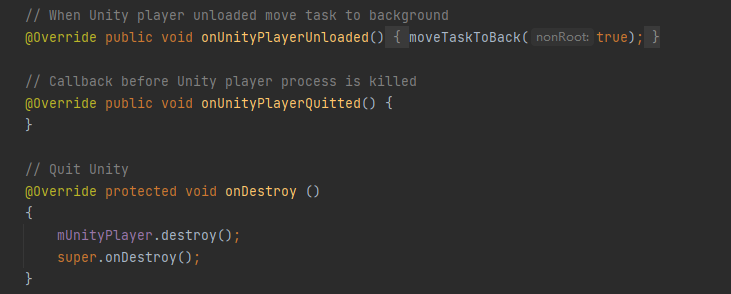 A:將項目導出成Android項目,此時導出的項目目錄unityLibrary\src\main\java\com\unity3d\player下有一份UnityPlayerActivity.Java文件,裏面的代碼是在控制UnityPlayer的生命週期。