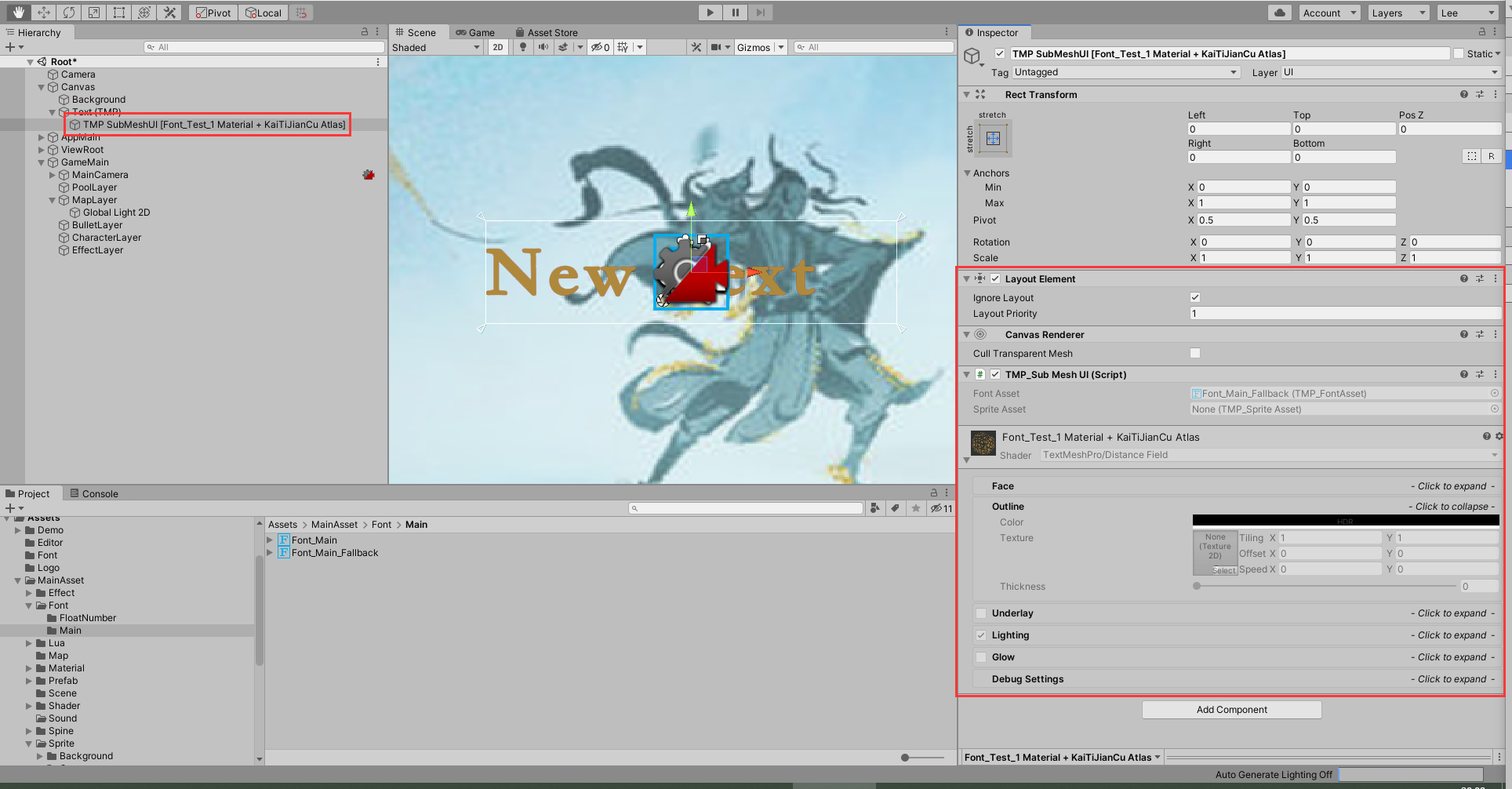 Q:現在在使用Unity 2019.4.34f1版本和TextMeshPro 2.1.6版本開發功能,在項目中有兩個字體,Font_Main和Font_Main_Fallback。