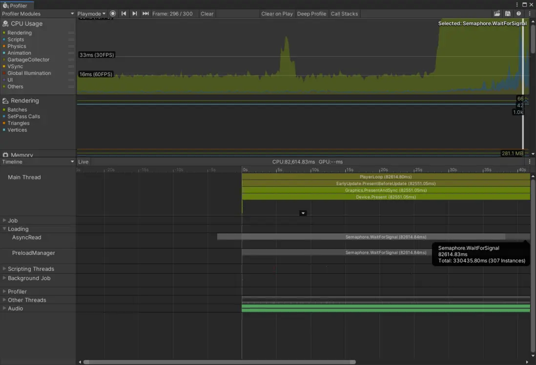 Q:MuMu模擬器運行一段不固定的時間後Device.Present耗時突然上升,其中看Profiler裏的有一個加載的信號量等待時間很長,不明白其中原因,想問問是否有朋友可以幫忙解釋。