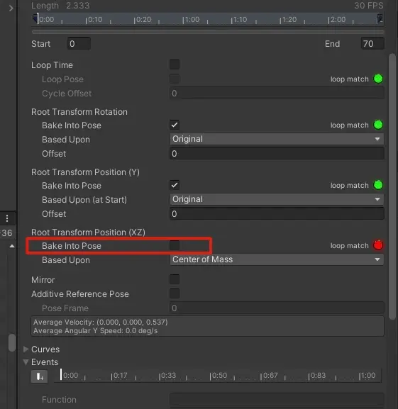 Q:請教一個問題:有個Attack動畫,它會在XZ軸方向上產生位移,我只想讓它在原地播放Attack,已經在Inspect面板對動畫禁用了XZ軸的位移,如下圖: