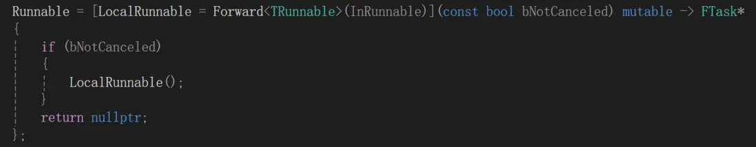 Task.Init函數調用有點繞,464行先把InQueuedWork包裝成一個Lambda函數,然後在Init實現裏面再把Lambda包裝到另一個TFunction裏面。這樣就把InQueuedWork存到Task裏面了,往後操作只和TaskGraph有關,與線程池無關了。