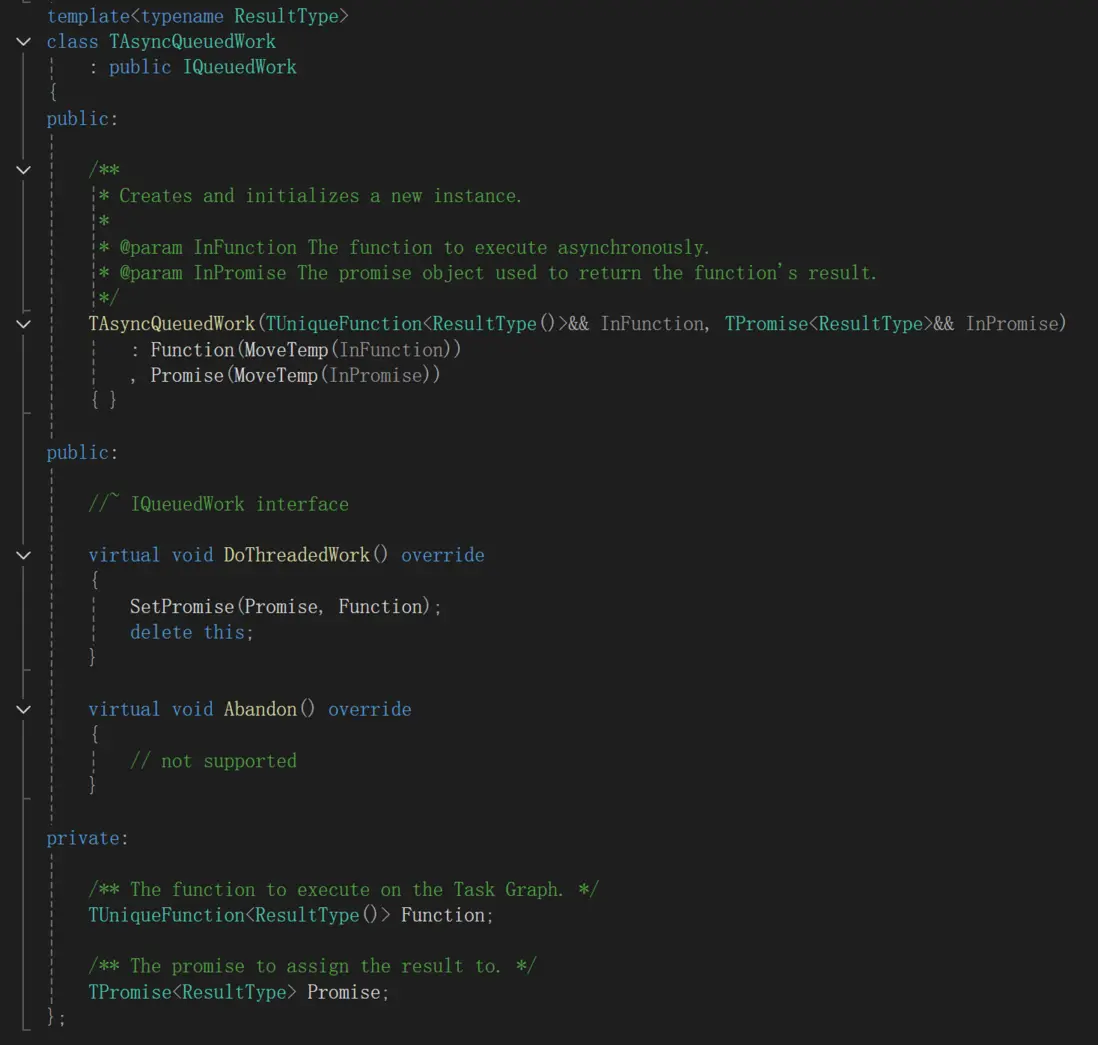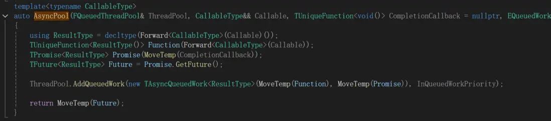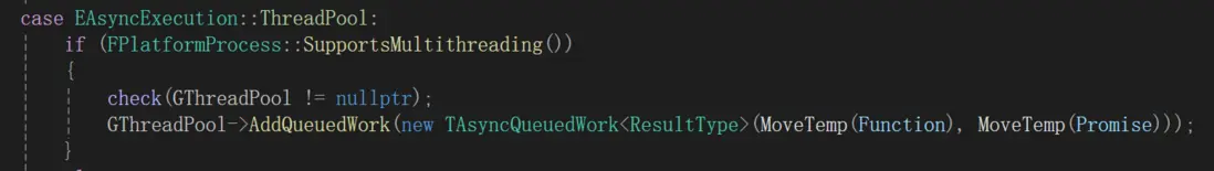函數內部會創建TAsyncQueuedWork封裝Function和Promise,然後使用AddQueuedWork接口把任務加到GThreadPool中。