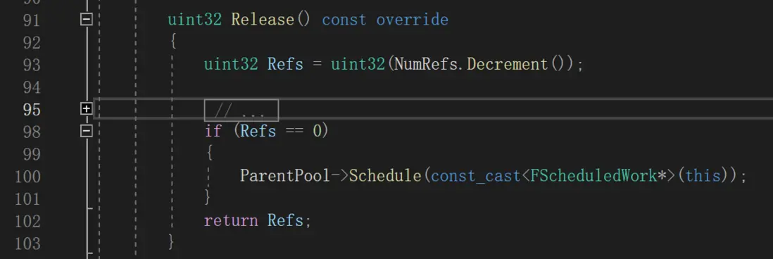 FScheduledWork執行完DoThreadedWork後,會調用Release,繼續讓線程池執行剩餘任務,並把自己重置,加入WorkPool中,等待下次使用。