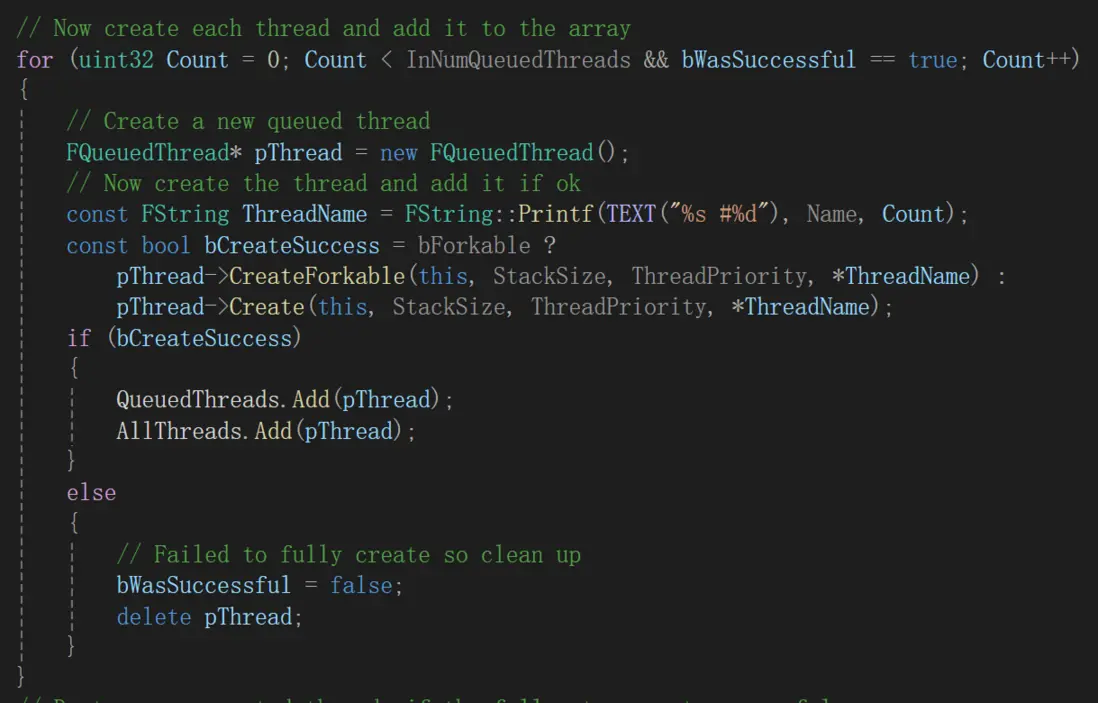 FQueuedThread繼承自FRunnable,是一個可運行任務的抽象,其Create函數如下。首先創建DoWorkEvent,用於做多線程同步,然後創建一個底層的Thread。線程創建好後進入Run方法,初始沒有任務,線程在DoWorkEvent上等待,處於休眠狀態。