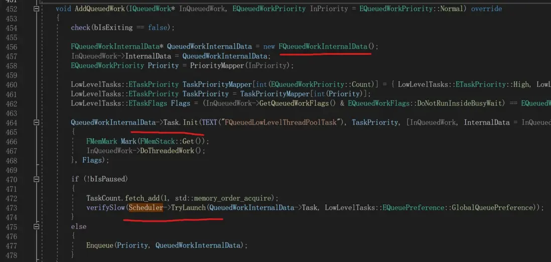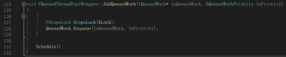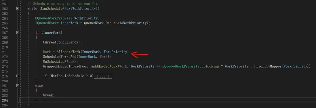 Schedule函數最重要的是下面幾行。首先從QueuedWork中獲取要執行的任務,然後遞增CurrentConcurrency。接着通過AllocateWork獲取一個FScheduledWork對象,並把InnerWork封裝在裏面,然後把FScheduledWork交給後台線程池運行。