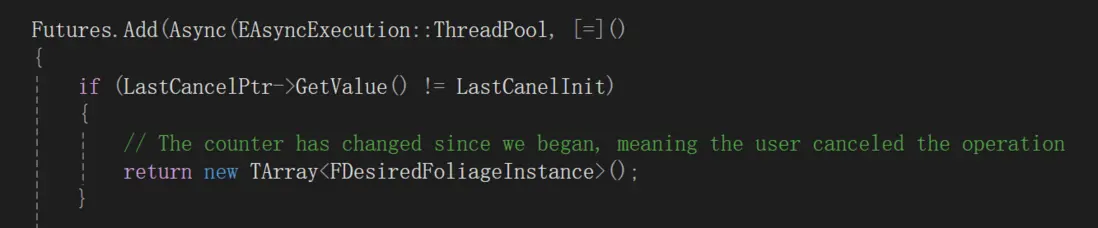 最常見用法,Async函數可設置EAsyncExecution::ThreadPool參數,指定任務在ThreadPool裏執行。