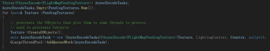 比如引擎中Encode LightMap的操作,就使用了FAsyncEncode類: