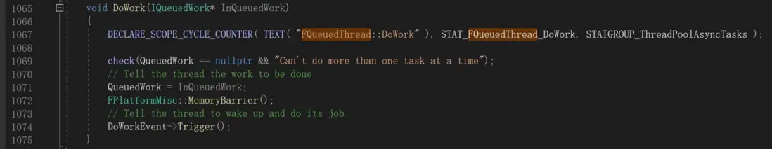 FQueuedThread::DoWork方法用於通知一個Thread要執行任務了,首先把InQueuedWork設置到其QueuedWork屬性上,然後執行DoWorkEvent的Trigger方法,喚醒該Thread。注意這裏加了一個MemoryBarrier,是為了避免CPU指令亂序優化導致1071行在1074行之後執行,導致錯誤。