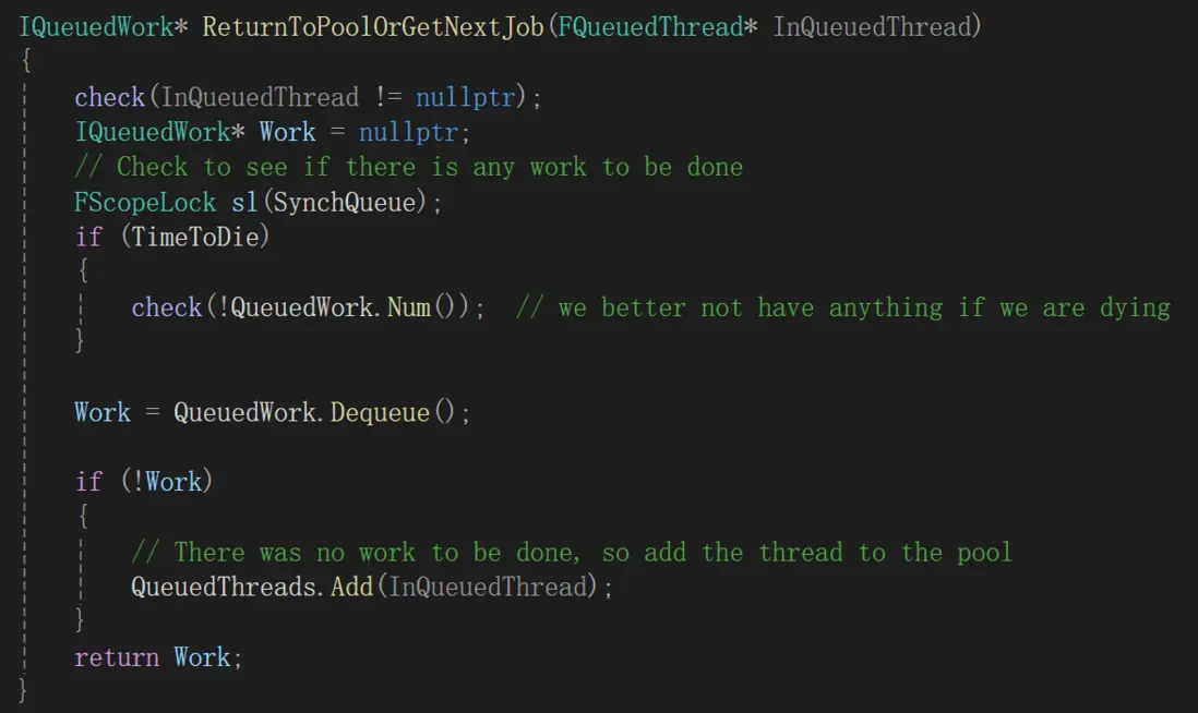 執行任務通過屬性的Run函數實現。Thread一開始會在DoWorkEvent上等待,被DoWork函數喚醒後,會獲取之前被賦值的QueuedWork,執行DoThreadedWork函數,這裏是真正執行任務。執行完成後再調用ThreadPool的ReturnToPoolOrGetNextJob函數,嘗試獲取暫存的QueuedWork並執行,若沒有就把Thread歸還到QueuedThreads中,之後在DoWorkEvent上等待,進入休眠狀態。