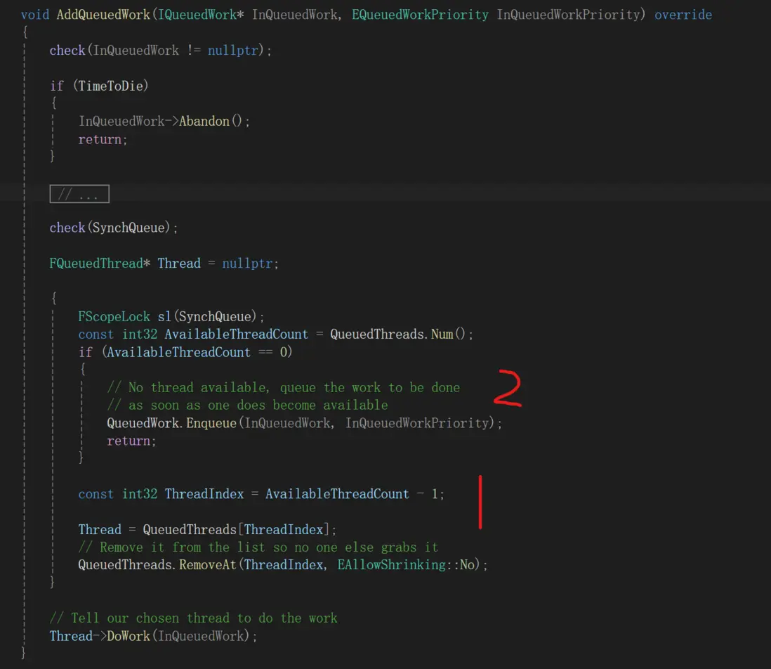 下圖中1的位置是Worker線程取Task,2的位置是執行InQueuedWork->DoThreadedWork(),終於又回到了線程池。
