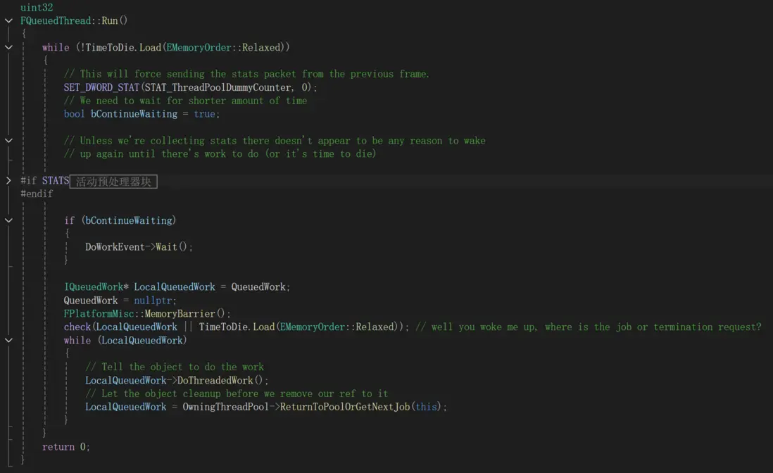 FQueuedThread:繼承自FRunnable,表示線程池中的工作線程。可以想象,它大部分時間都處於idle狀態,當有任務來時才工作。