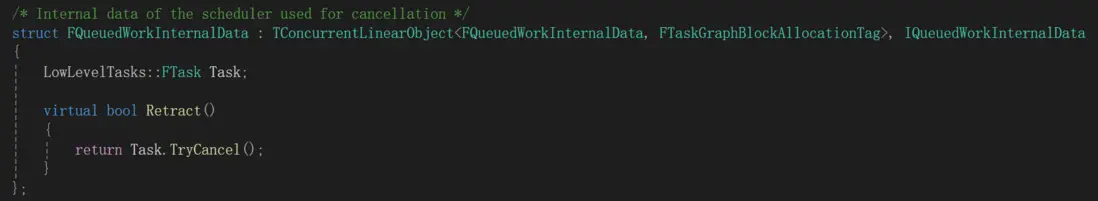 FQueuedWorkInternalData類包裝了一個LowLevelTasks::FTask,FTask用於把QueuedWork包裝成TaskGraph裏可執行的東西。Retract函數用於取消任務,但線程池場景下不需要考慮取消。