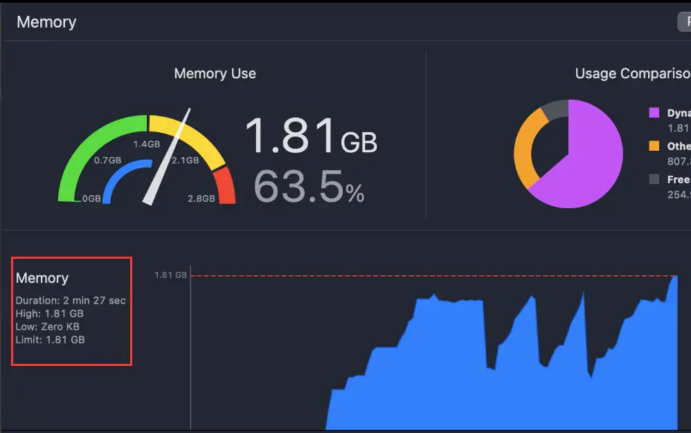 iOS系統,比如普通4G設備,閃退內存也大概為2G左右,通過Xcode可以看到一個紅線,到了紅線即觸發閃退,在2G前的一定內存回收到lowMemory,下圖的藍色驟降的地方就是收到lowMemory釋放內存,可以作為內存釋放的保底方案,只要不是突然申請比較大的內存應該都可以(像最右端的就是突然一大塊內存達到了Limit直接閃退)。
