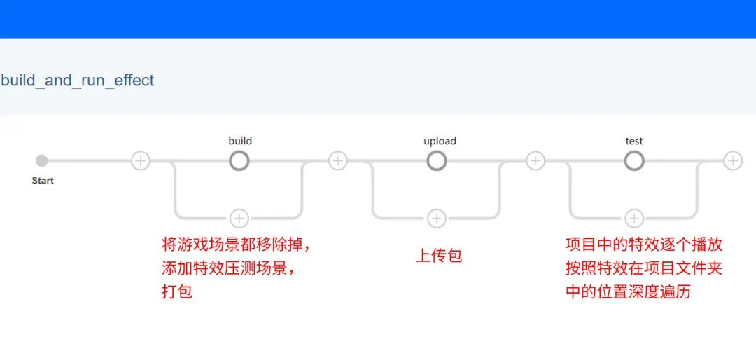“Build”自動打包步驟我們在此不進行贅述,各個團隊可以選擇適合自己項目的打包方式,在Pipeline內直接編寫命令,或者調用已有的打包腳本,確保每次開展測試時,都能從項目中拉取最新的特效資源,實現項目特效資源的自動化打包。