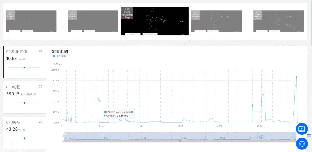 - GPU耗時和GPU Cycles: 直接查看粒子特效在真機播放時的GPU性能開銷。研發團隊可以設定一定的閾值(例如3或5ms),對於超過開銷閾值的特效可以篩查和監控;