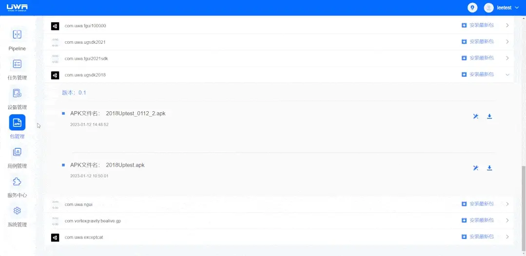 首先,例如“特效包”等可執行的測試包都可以上傳至包管理,然後在真機設備上實現批量化的包體安裝,大幅提高效率。