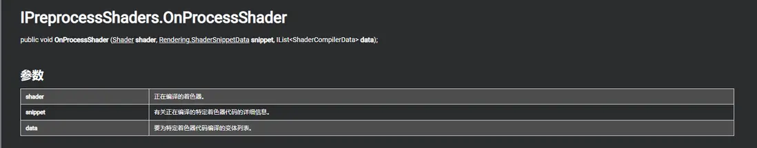 如圖的三個參數:“shader”表示回調函數當前在處理的Shader資源,”data”是參與編譯的變體列表。所以data.count()就是該Shader資源的(參與編譯的)變體數量了。所以,只要在回調函數邏輯裏把這兩個參數Log輸出就行了。