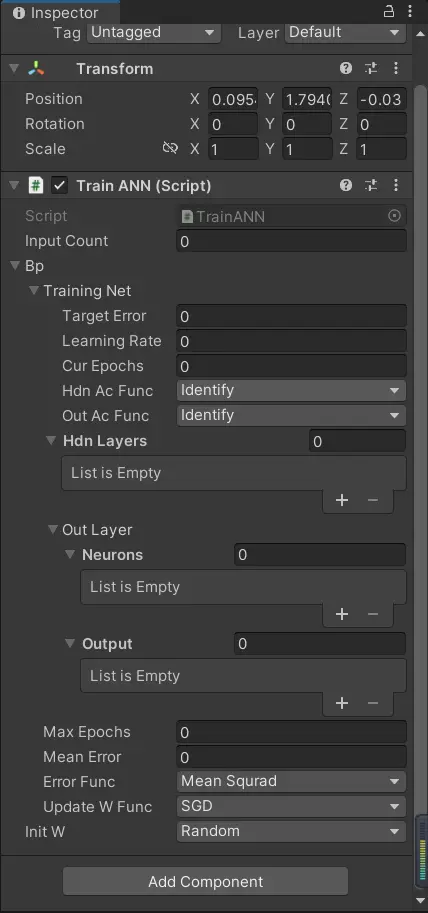 將它掛載在場景的任一物體上,不出意外的話,你可以在編輯器看到神經網絡類的許多關鍵變量都可以顯示出來(如果你的沒有,就要注意是否遺漏[System.Serializable]或設置成了私有類):
