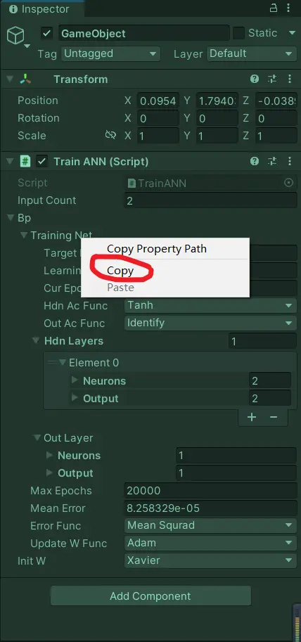 可一旦結束Unity運行後,編輯頁面這些被訓練好的參數就又變回去了,這該怎麼辦?很簡單,一旦訓練完後,就暫停運行(是暫停,不是結束),右鍵神經網絡的名字,將它複製下來。