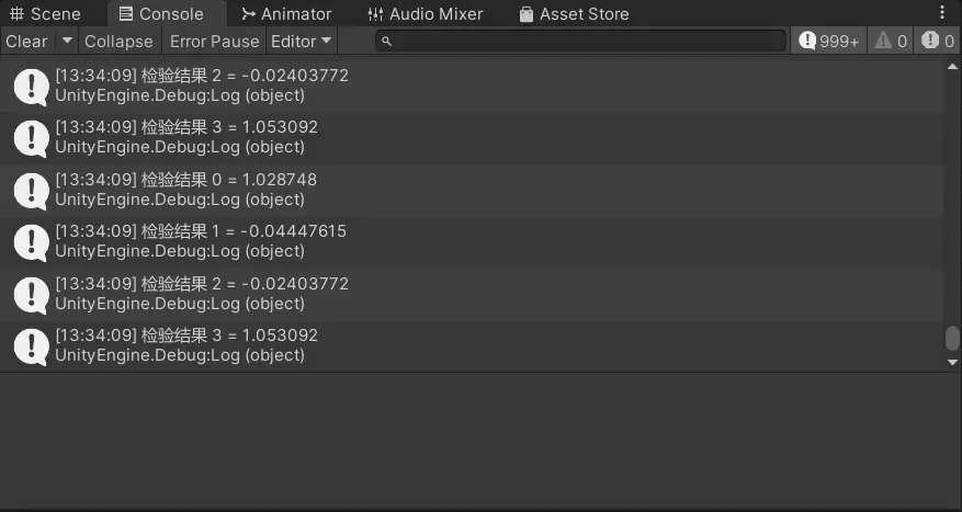 然後我們開始運行,不出意外的話,訓練很快就結束了(大概只花了100多次迭代),你也可以看到Console面板打印了神經網絡的輸出結果: