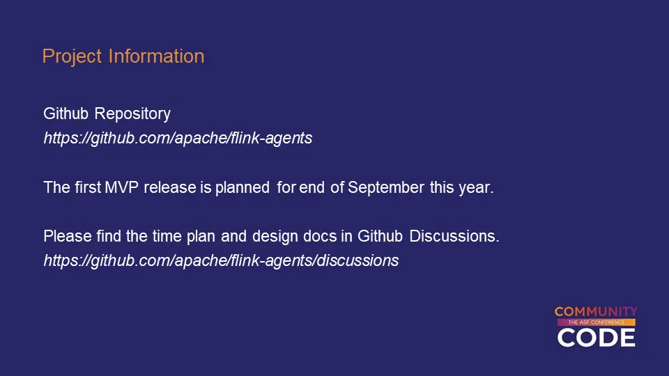 基於上述技術背景,Apache Flink社區在2025年發起了Flink Agents項目。這個項目非常年輕,5月份提出提案,6月份正式投票通過,到目前為止只有幾個月的時間。有趣的是,這個項目是真正從零開始在社區中全新搭建的,而不是某個公司內部項目的開源版本。