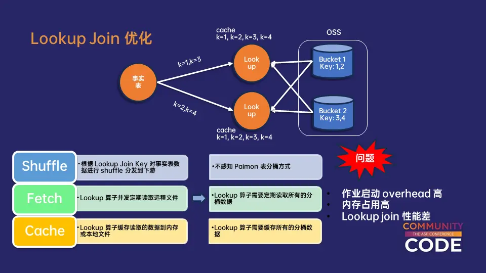 核心問題是Flink的 Lookup 算子不知道Paimon的分桶策略。每個併發 Lookup 算子假設它可能需要與維度表中的任何記錄連接,導致每個算子需要維護所有維度數據的完整副本。這意味着無論有多少並行算子處理Lookup Join,每一個都需要讀取整個Paimon表並在本地緩存所有維度數據。
