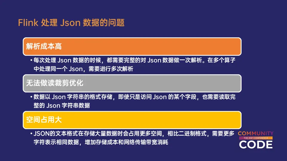 存儲也有同樣的問題。JSON的基於文本的格式雖然人類可讀且廣泛支持,但消耗的存儲空間比等效的二進制表示形式多得多。這種增加的存儲佔用直接轉化為更高的成本和在隨機操作期間增加的網絡帶寬消耗,其中數據在流處理管道中的算子之間移動。