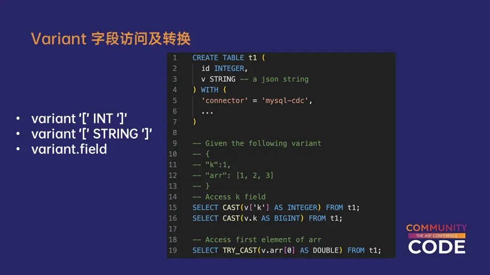 Flink 2.2版本將進一步完善Variant數據類型的功能,重點提供更加靈活和強大的字段訪問能力。用户將能夠使用直觀的語法訪問Variant類型中的嵌套字段,同時支持靈活的類型轉換操作,使得Variant類型能夠與現有的強類型處理流程無縫集成。