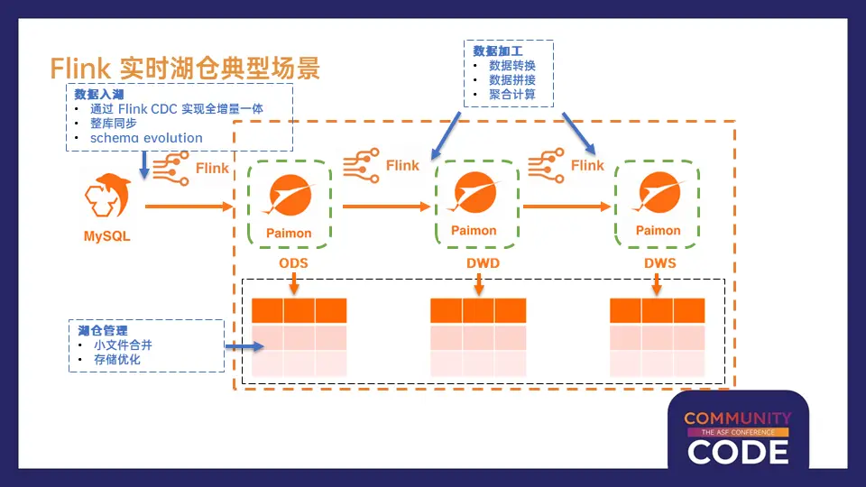 Flink CDC在彌合操作數據庫和分析系統之間的差距方面已被證明特別有價值。與需要在固定時間表上運行的複雜ETL管道不同,Flink CDC使組織能夠實時捕獲來自MySQL等源系統的變更,並直接將其流式傳輸到Paimon的ODS(操作數據存儲)層。這種方法不僅減少了延遲,還通過消除對中間暫存區和複雜協調機制的需要來簡化整體架構。