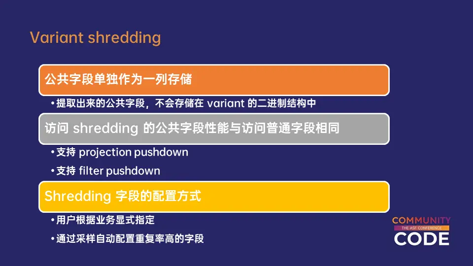 同時,這個版本還將支持Variant配置的shredding字段功能,允許用户根據數據訪問模式手動配置哪些字段需要進行shredding優化。這為有明確數據訪問模式的企業用户提供了精細控制的能力,能夠針對具體的業務場景進行深度的性能調優。
