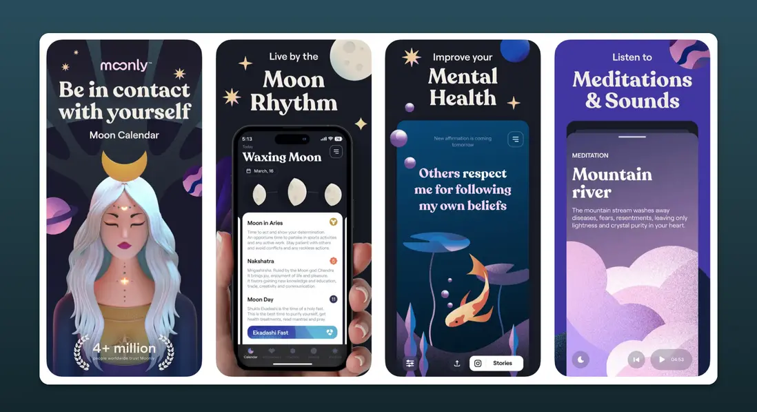 文章內容,好看的插畫,冥想,塔羅牌,月亮占星術,這些可能看似很小眾的東西,但是用户卻很多,這個產品增長非常快,也很容易被蘋果官方推薦。這也是上週美國今日推薦的APP。上週也看到了蘋果編輯推薦的5款占星術APP。