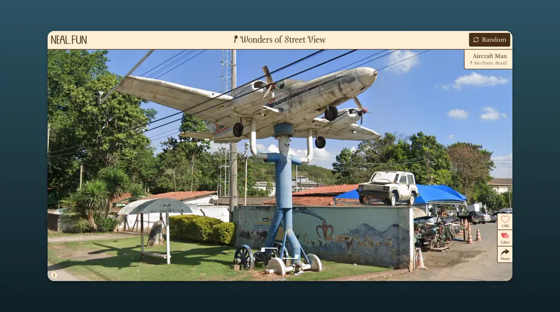 這個作者 @nealagarwal 做了很多有趣的網站,彙總在 Neal.fun 上。上週看到又發佈了這個街景奇觀的項目,非常有趣,隨機展示一個很奇怪的 Google 街景。