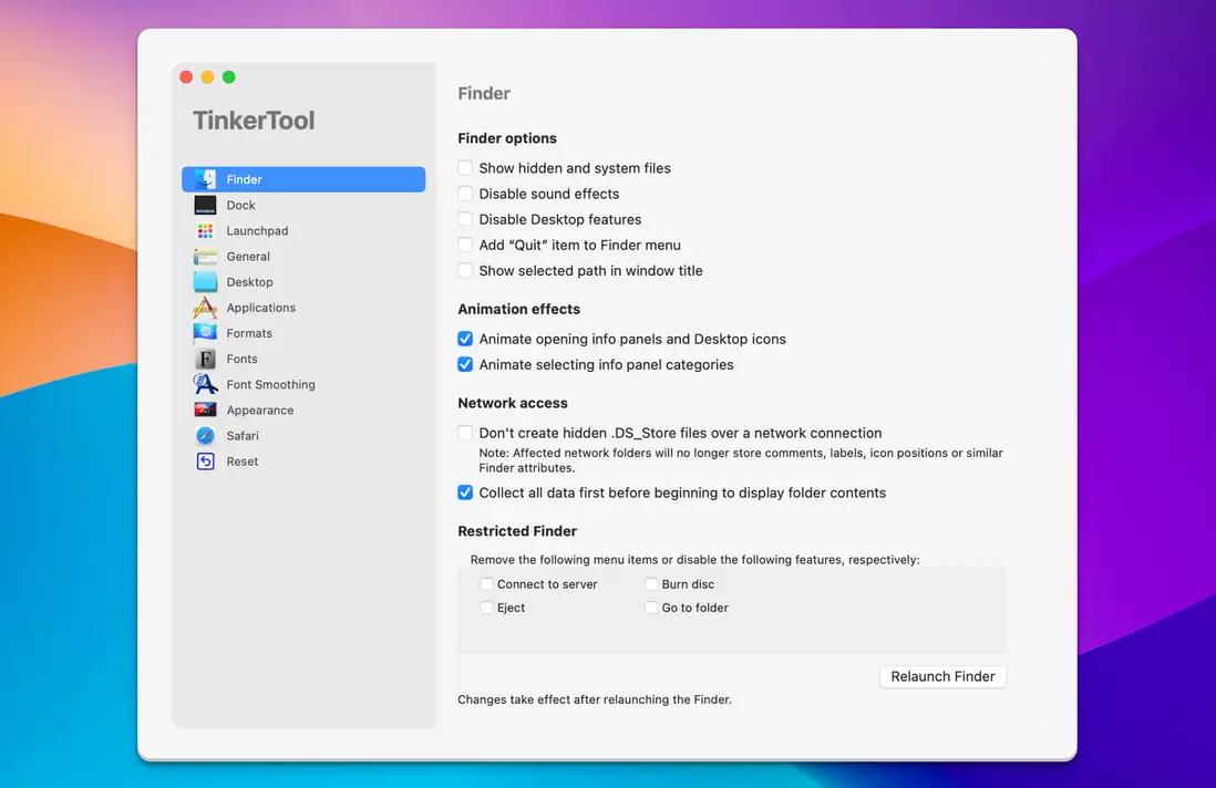 這是一款Mac平台的系統深度設置維護工具,以幫助你修改一些系統隱藏的屬性,包括系統界面字體,是否不顯示隱藏文件等,不會損壞系統,設置僅僅對當前用户有效。還有很多功能可以去研究一下。