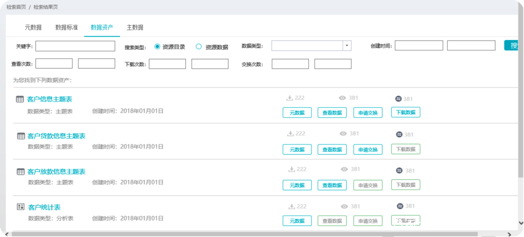 檢索條件包括:關鍵字、搜索類型、查看次數、下載次數、交換次數、創建時間等豐富的檢索條件,從而實現數據資產快速查找定位。