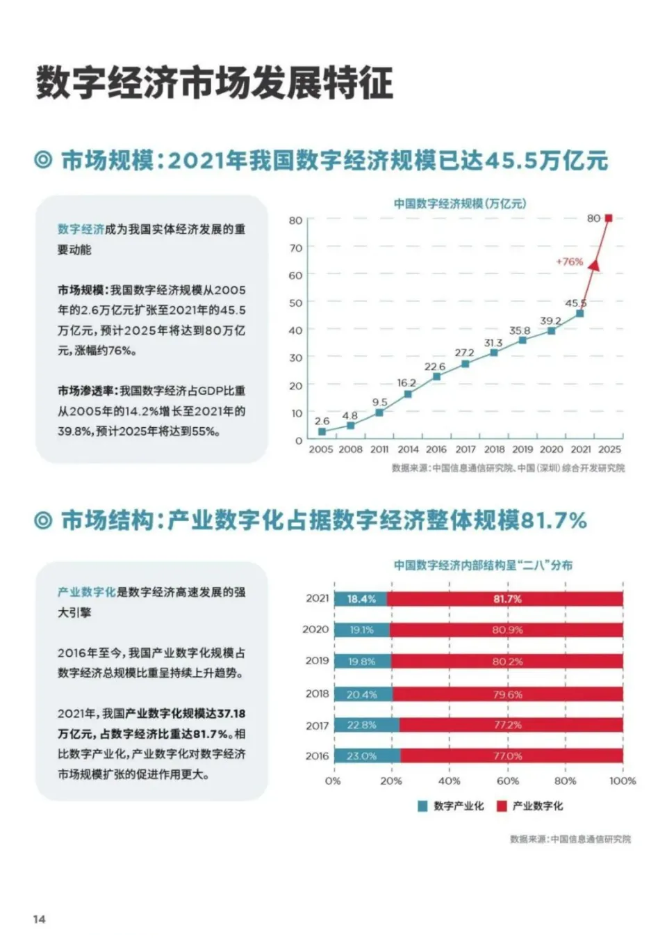 我國《“數字經濟” 規模》從 2005 年的 2.6 萬億元,擴張至 2021 年的 45.5 萬億元。預計 2025 年將達到 80 萬億元,漲幅約 76%。