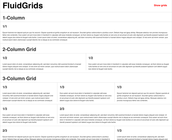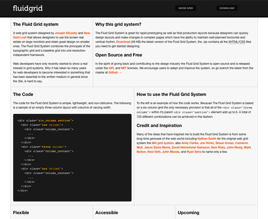 Tiny Fluid Grid helps you generate your own fluid grid with 12, 16 or 24 columns, minimum and maximum widths, and percentage-based gutters.