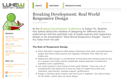 Luke Wroblewski’s conference notes on Ethan Marcotte’s presentation about applying responsive Web design principles and workflows to the redesign of a major newspaper website. Among other things, Ethan explains how he approaches the responsive design methodology, what the design process looks like and how prototyping is done in the context of responsive design.