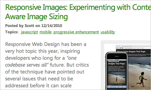John Faulds presents a technique for responsive images that is different from the techniques presented above. It involves querying the device’s user agent string to determine whether it is mobile, and then setting a global variable that can then be used in templates to modify the size of the image output. Basically, only one image gets sent to the browser, but that image is different depending on whether you’re viewing the page on a mobile or desktop device.